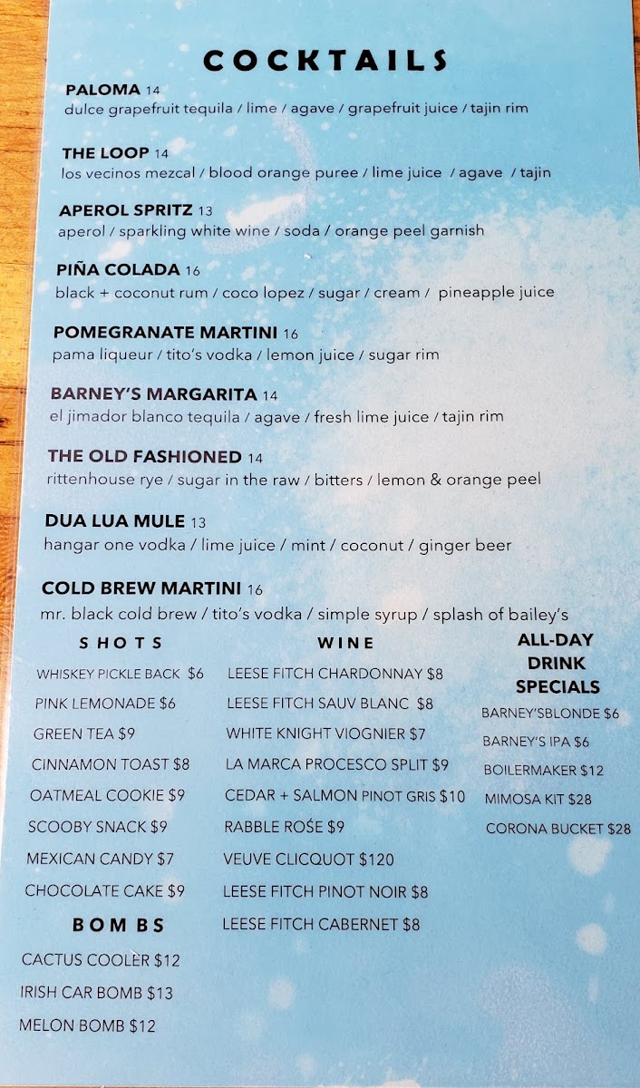 1/3 lbs all beef patty, applewood smoked bacon, arugula, caramelized onion, tomato, bleu cheese, and barney's sauce