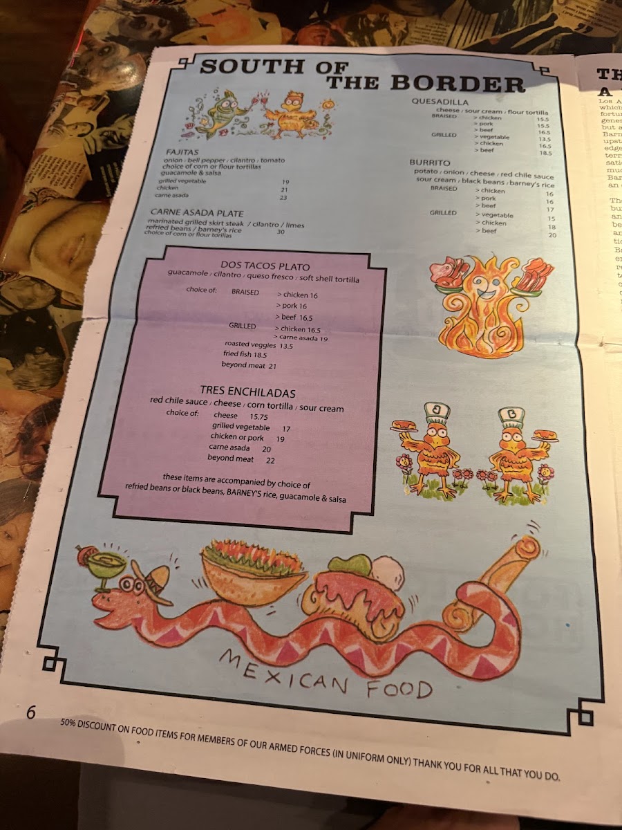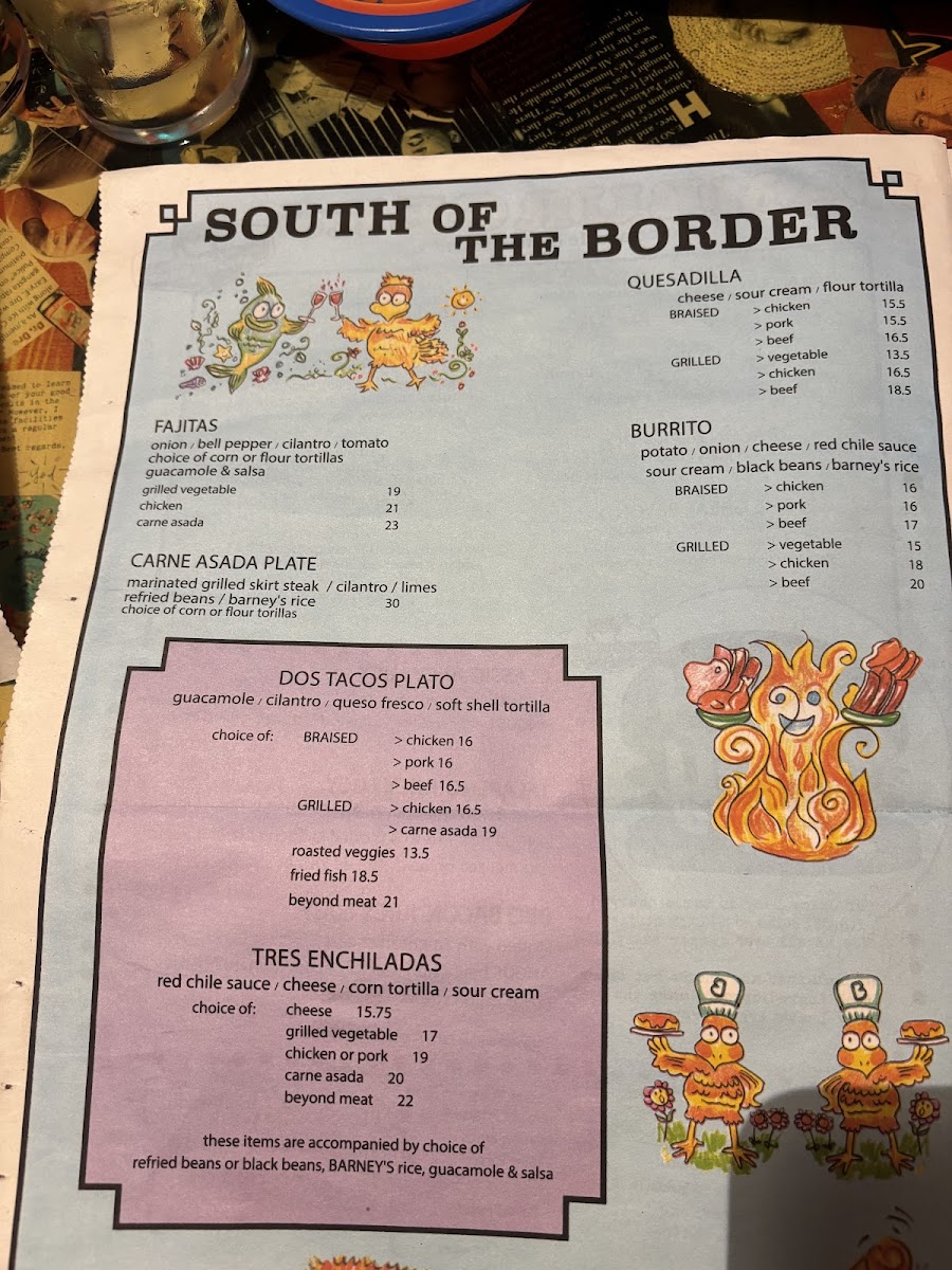 Potato, onion, cheese, red chile sauce, sour cream, black beans, and barney's rice